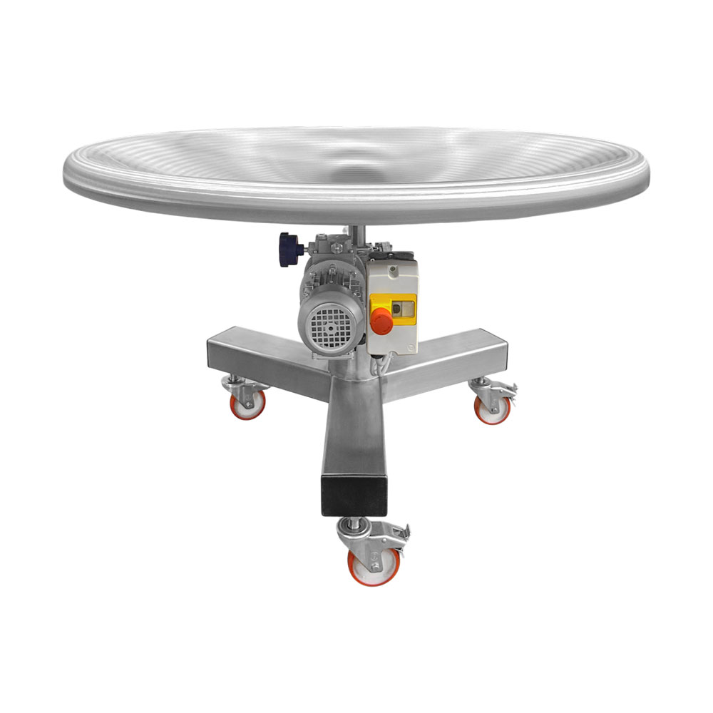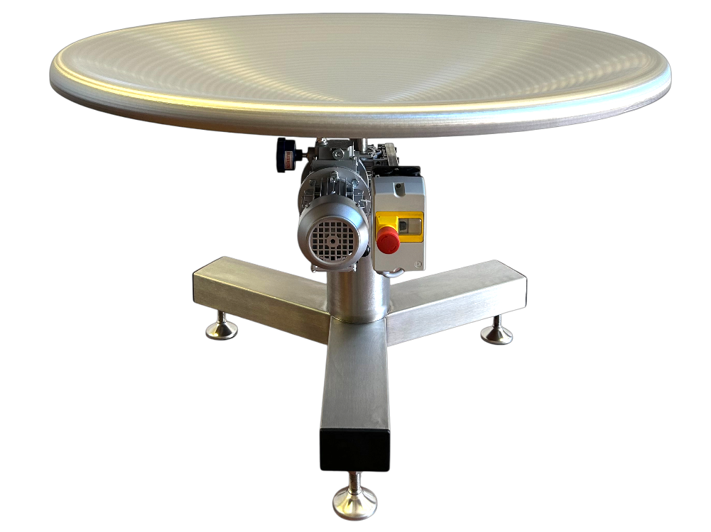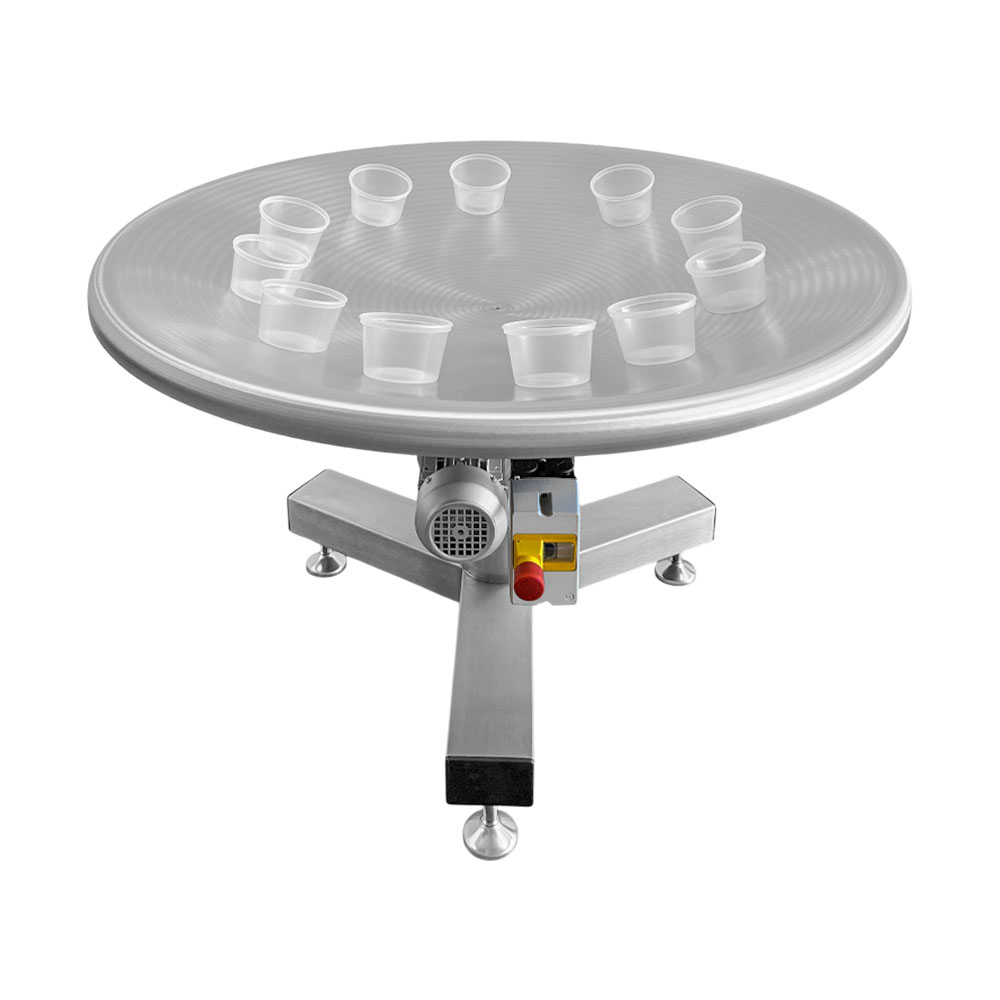 Collocato nella parte finale della linea di confezionamento, il Tavolo Rotante Concavo svolge la funzione di “stazione di accumulo”, facilita la fase di scarico del prodotto in uscita dalla macchina confezionatrice, e agevola le operazioni di prelevamento e inscatolamento all’operatore. Il vassoio girevole, così come tutta la struttura della macchina, è costruito in acciaio inossidabile AISI 304 Satinato. La velocità del disco rotante, può essere facilmente regolata tramite pomello moto-variatore meccanico.